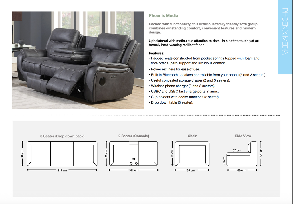 The Phoenix Media Collection is the ultimate choice for those who want comfort, technology, and style in one stunning package. Upholstered in a soft yet resilient fabric, this family-friendly recliner sofa range is designed for everyday living while adding a touch of modern luxury to your home.