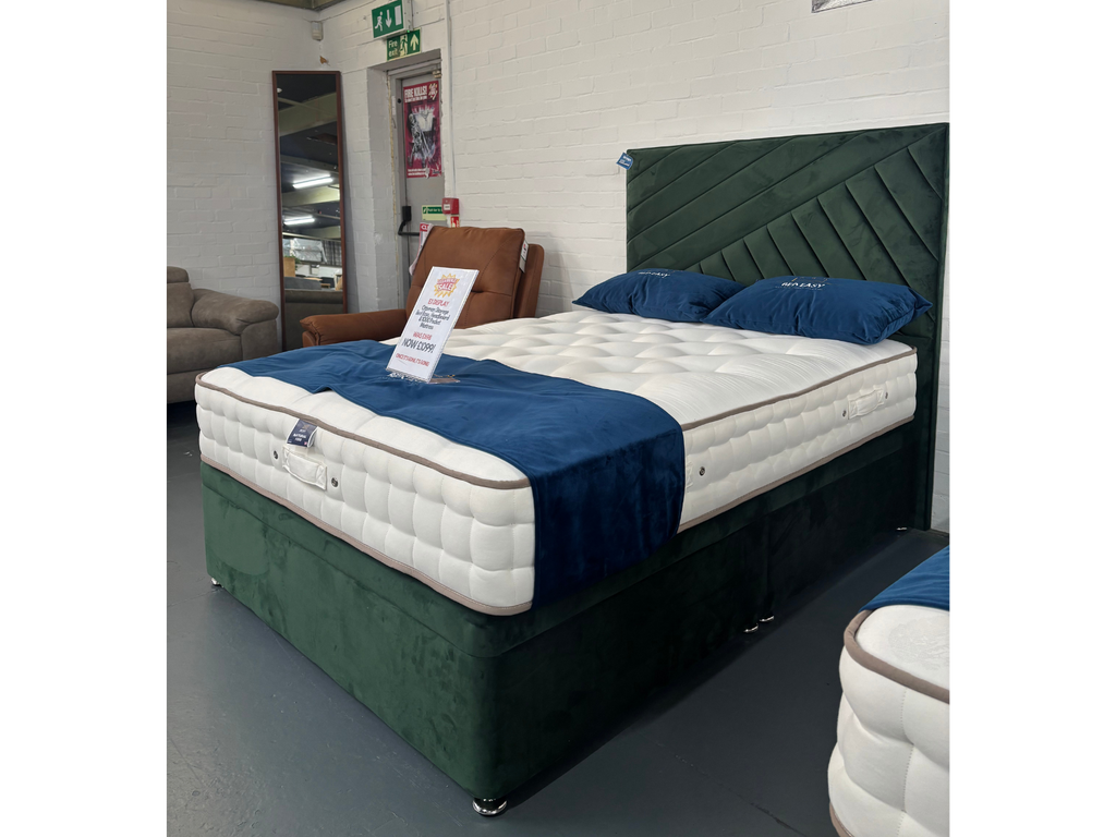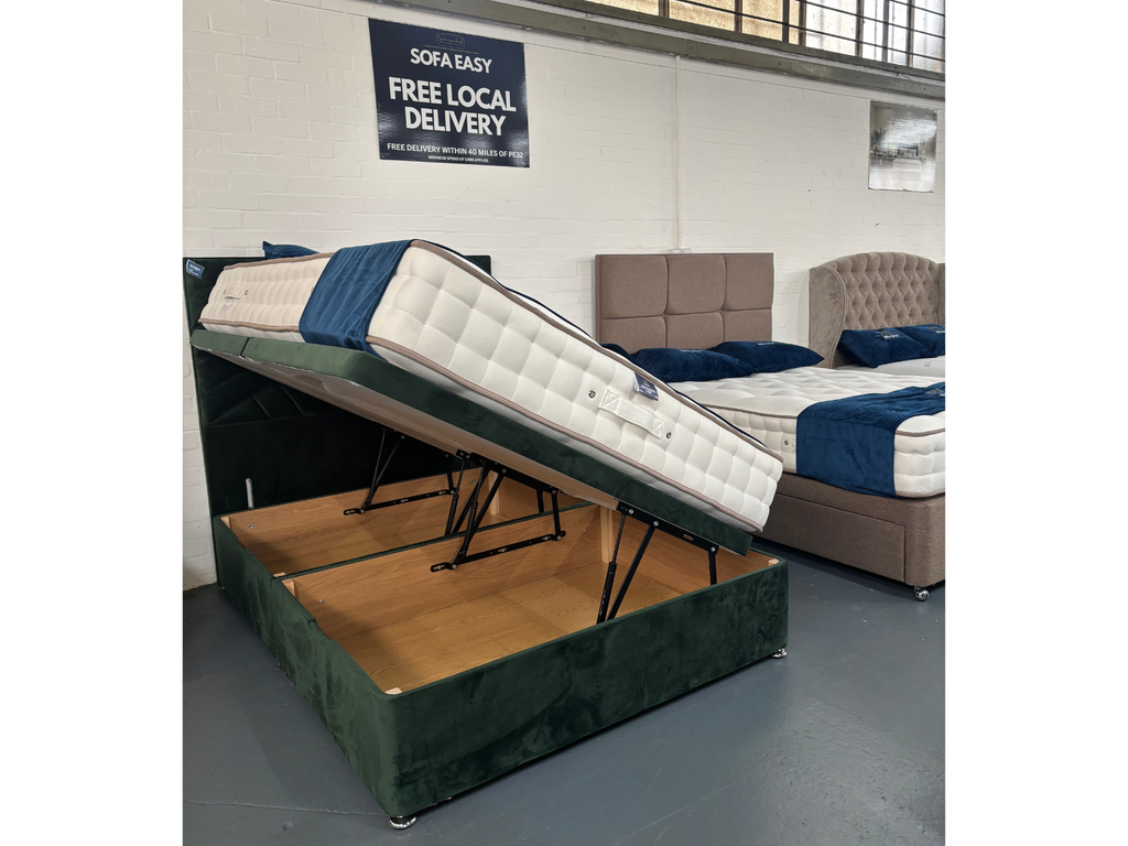 The beautiful 1000 pocket natural filled mattress sits on the opulent side opening ottoman base with floor standing headboard. Please ensure you have enough room to take delivery as the headboard is large.