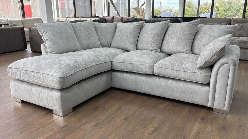 With foam filled cushions, an array of scatters and a supportive arm cushion, this sofa not only looks great but offers maximum comfort too. Available in Silver and Truffle, this sofa is an all around winner. This left or right hand corner can be converted in to a large cinema sofa if purchased with the matching footstool. Dimensions: Length 240x180cm Depth 90cm Height 85cm