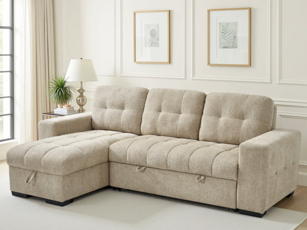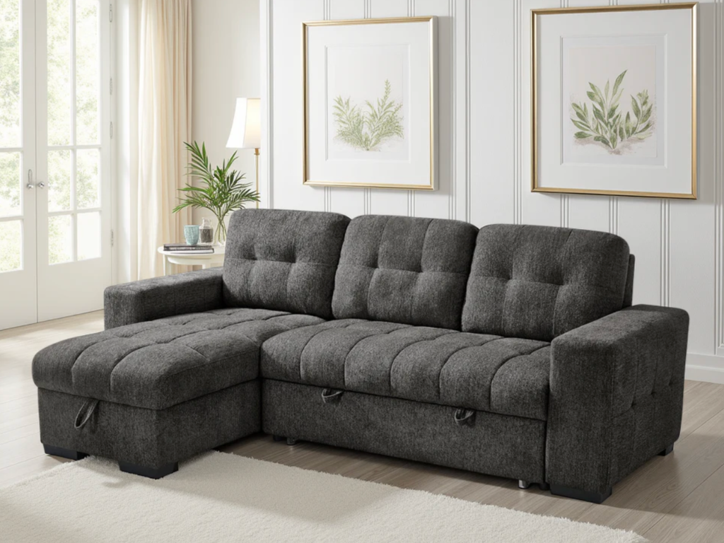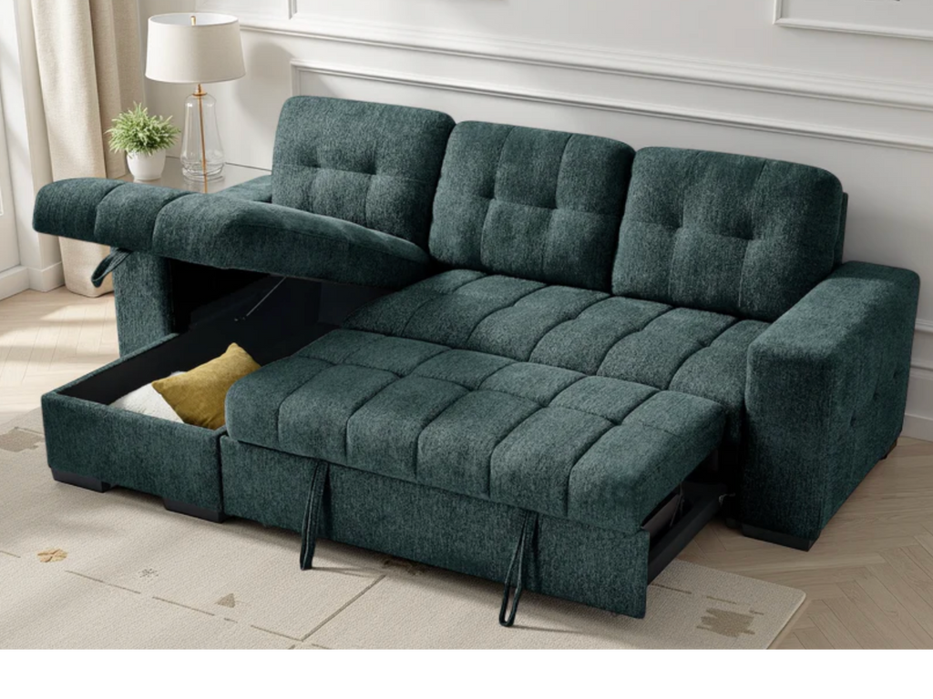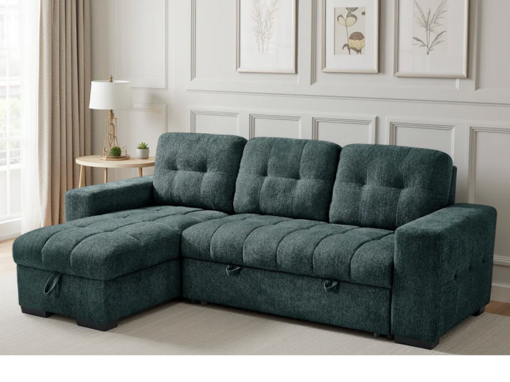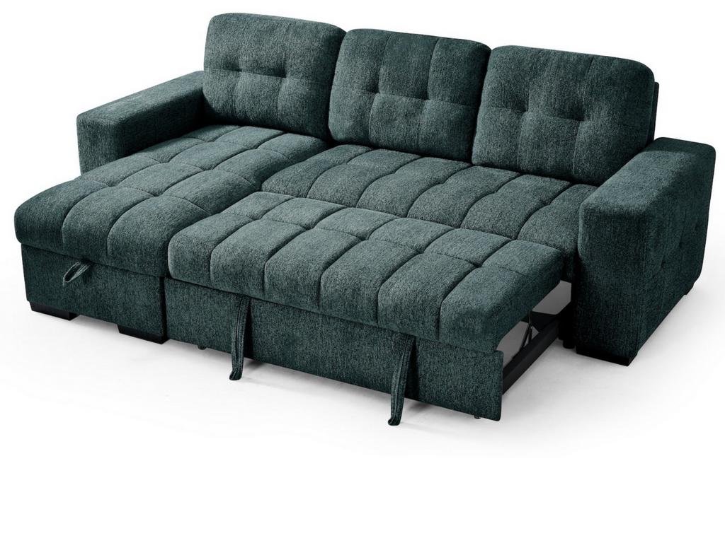 The Palermo universal sofa bed features plenty of storage, pull out sofa bed and a chaise that can be configured either left hand facing or right hand facing to suit your living space. 3 trendy colours to choose from Green, Grey or Beige.